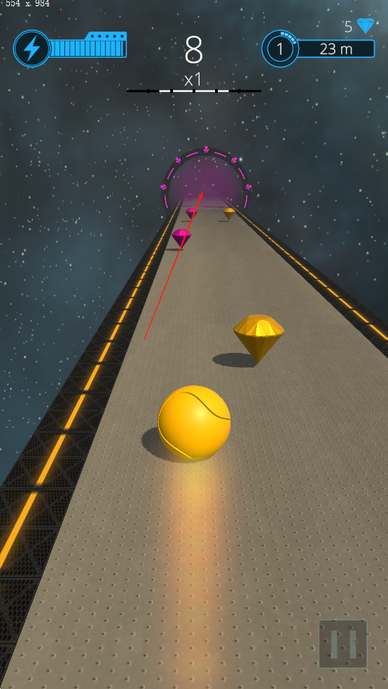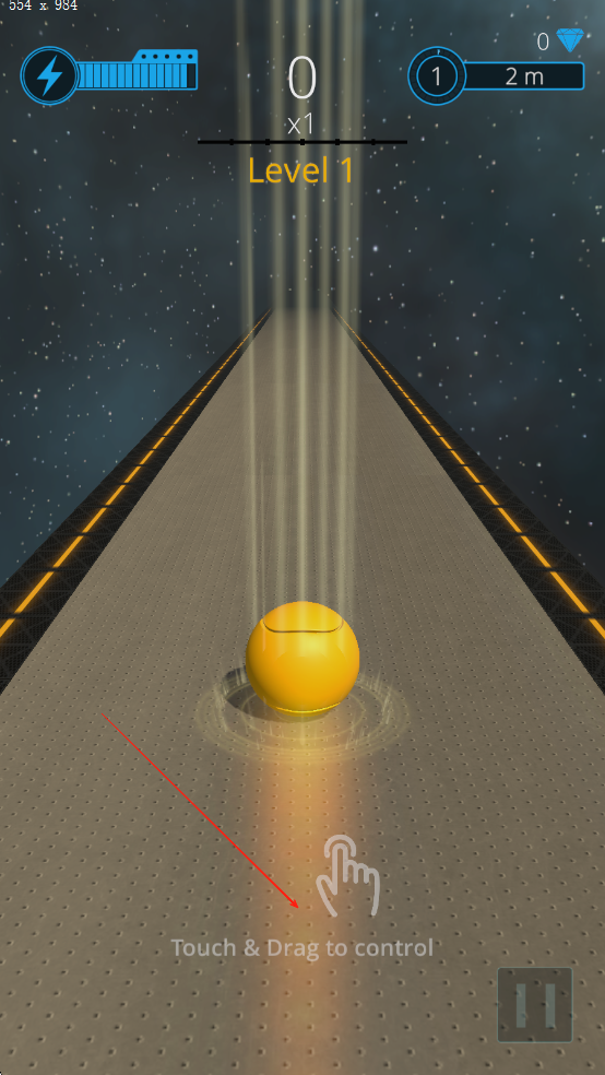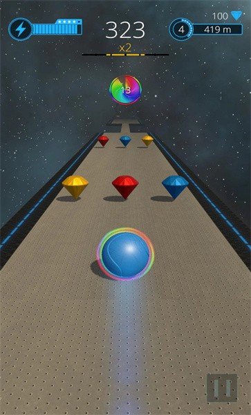 1、进入游戏后通过滑动屏幕控制球体左右移动,首次闯关需适应惯性原理,在平直赛道上练习精准转向以收集初始宝石。