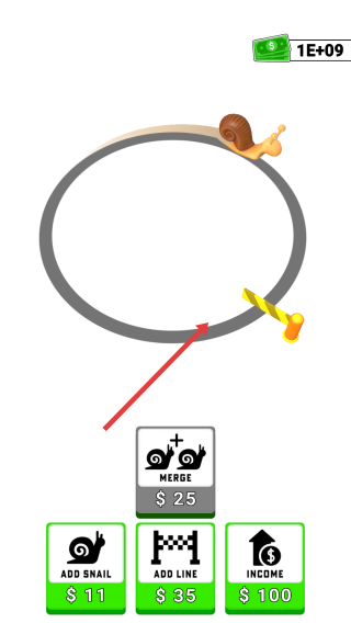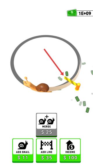 1、轨道循环:蜗牛沿环形轨道爬行,经过黄色栏杆处掉落金币,积累收益(界面显示“1E+09”)。
