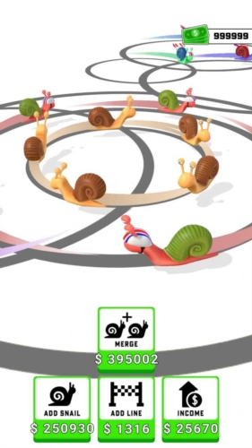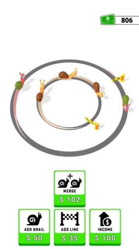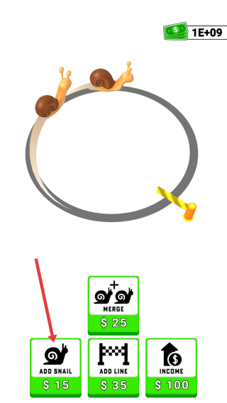 2、操作策略:点击“ADD SNAIL”(价格变化,如$11→$15)新增蜗牛,提升金币产出;用金币点“MERGE”合并蜗牛,或“ADD LINE”“INCOME”强化收益。