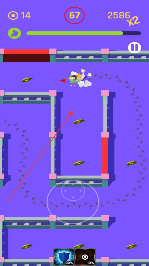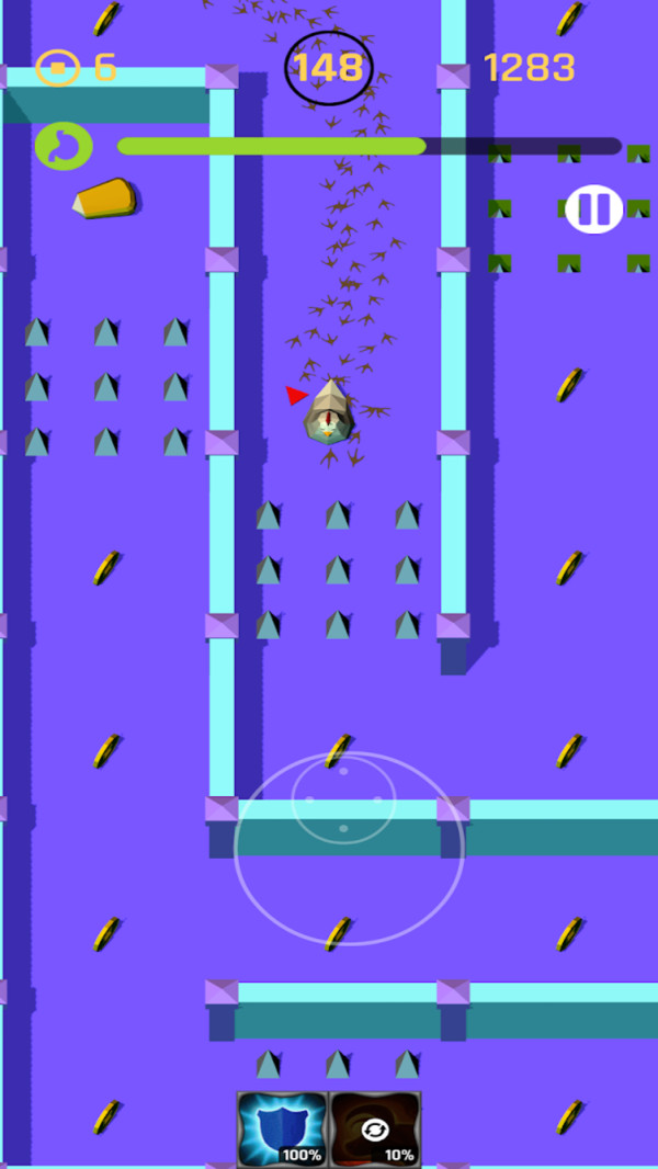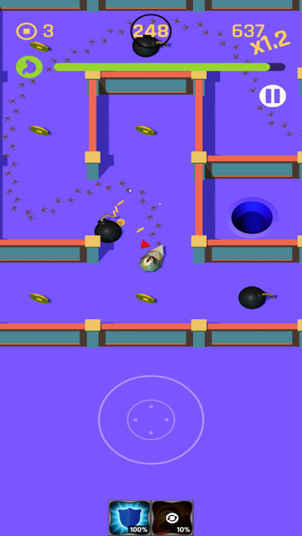 1、通过虚拟摇杆(底部圆形)操控角色移动,躲避场景中炸弹、尖刺等障碍。