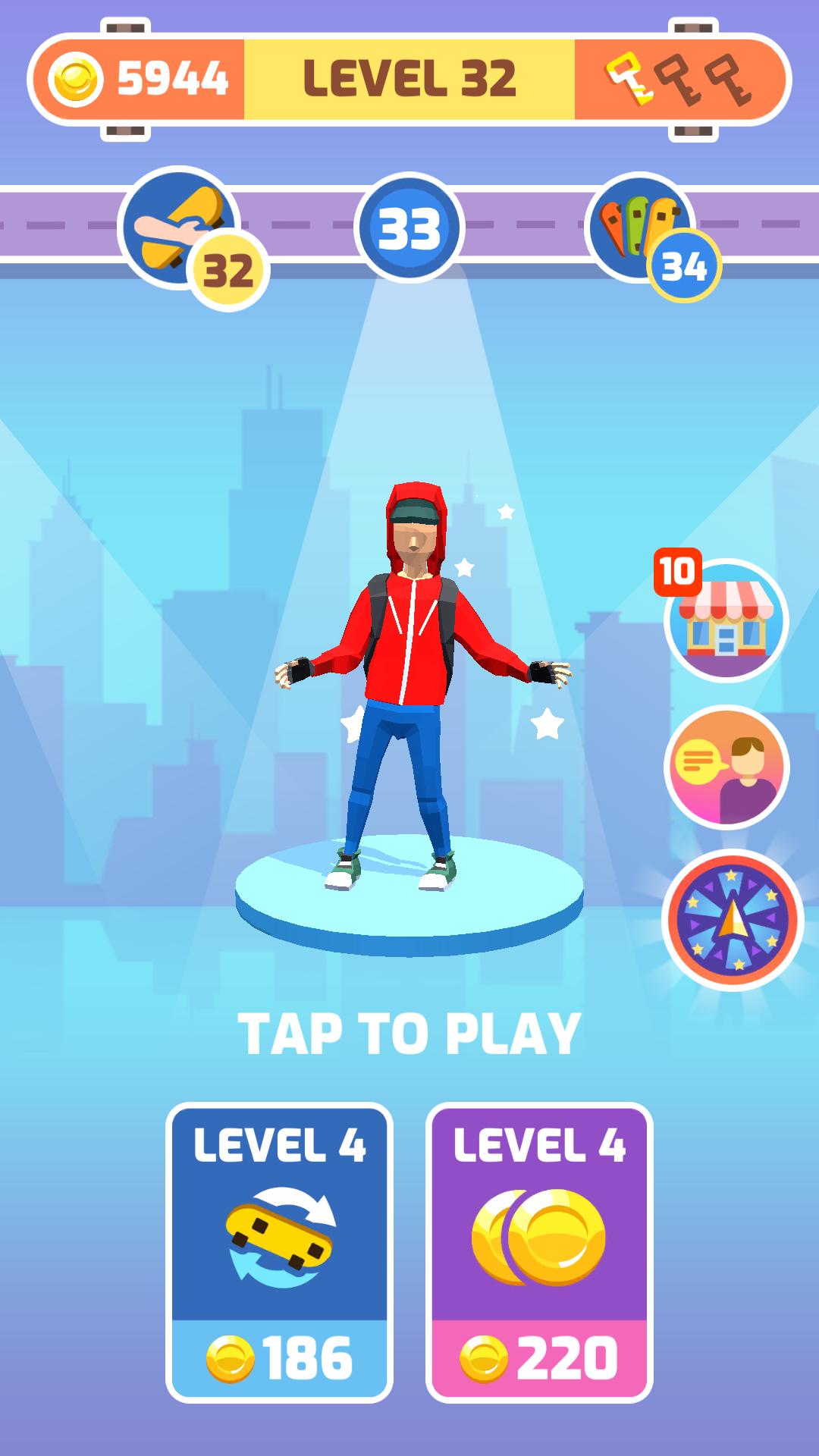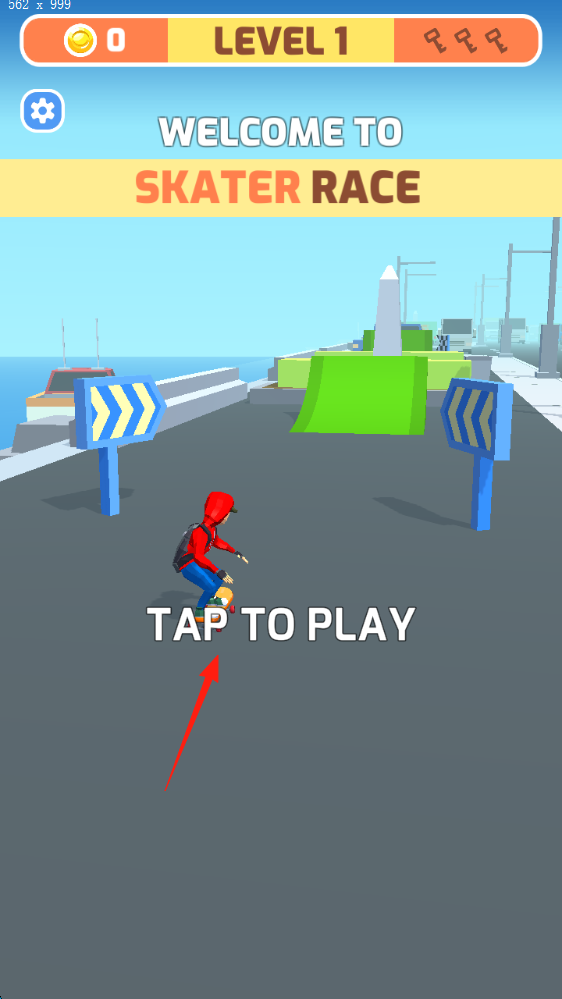 1、开局引导“LEVEL1”点击“TAPTOPLAY”开始,控制红衣滑板角色,在沿海赛道滑行。