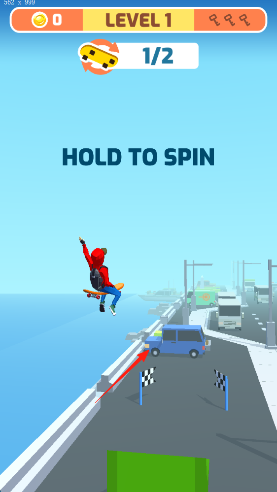 2、特技操作遇坡道,长按“HOLDTOSPIN”触发翻转特技,完成“1/2”旋转目标,避开车辆(蓝色面包车)。