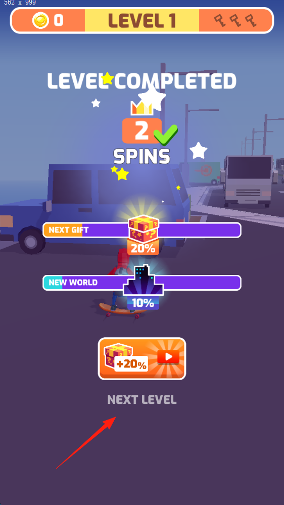 3、关卡结算完成“LEVEL1”得2次旋转(SPINS),进度条显示“NEXTGIFT(20%)”“NEWWORLD(10%)”,点“NEXTLEVEL”进下一关。