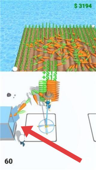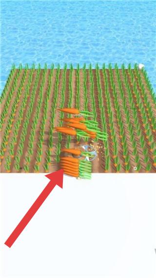 3、呈现农场收割与收集胡萝卜流程,有农田、收割角色、胡萝卜堆,是收割作物并运送存储的玩法环节,属于模拟农场经营、强调收割与物资处理的内容。