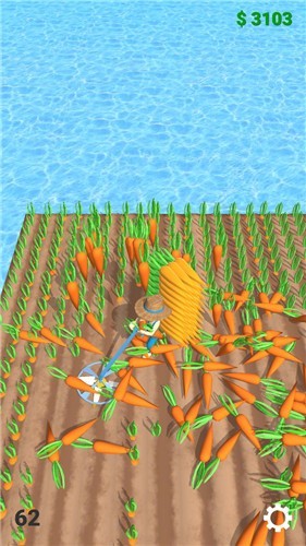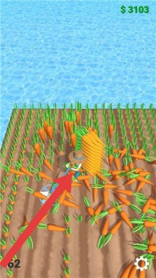 2、呈现农田场景,有角色、胡萝卜作物、收割工具,上方显示金钱$3103,是农场收割玩法,玩家操控角色收割作物,属于模拟农场经营、侧重收割操作的内容。