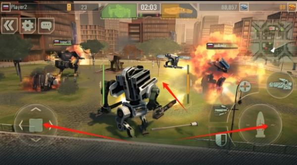 2、格斗操作技巧:虚拟摇杆控制机甲移动,点击按钮释放拳击、踢击等近战技能,滑动屏幕瞄准发射远程炮弹,利用地形规避攻击。