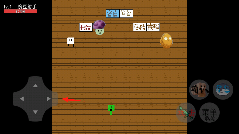 1、开局选择在标题界面,点击“开始”,进入游戏主场景,操控“豌豆射手”角色。