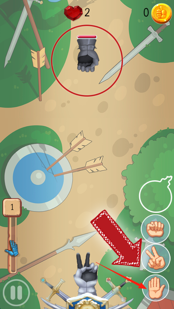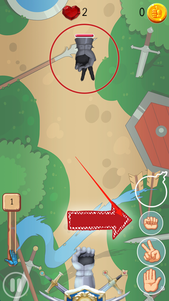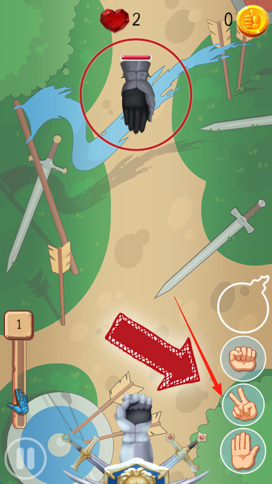 2、按箭头方向移动,接近敌人,根据情况,点击对应手势(如剪刀)互动。