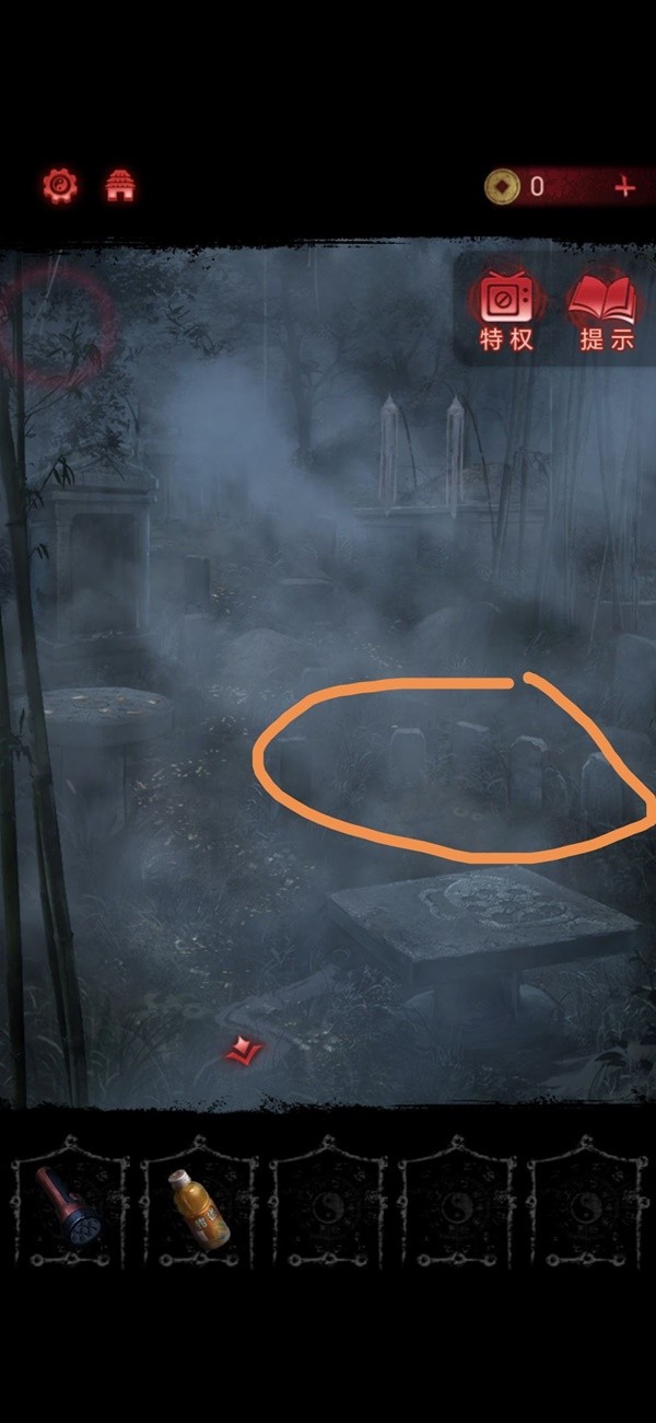1、村口初始互动:点击左下角书包,拾取「手电」和「饮料」;与老头对话,触发“供奉衣物”任务,解锁坟场场景(右侧箭头进入)。