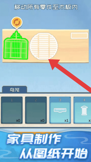 1、任务提示“移动所有零件至木板内”,涉及“鸟笼”制作,呈现的是家具制作类,按图纸组装鸟笼零件的环节。