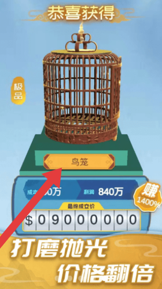 2、实体信息有:“恭喜获得”极品鸟笼,利润840万、赚1400%,呈现的是制作并获得鸟笼,查看收益及道具效果的场景。