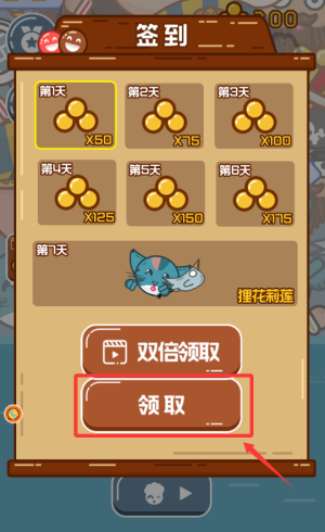 2、点击底部红框领取按钮,每日签到领金币奖励。