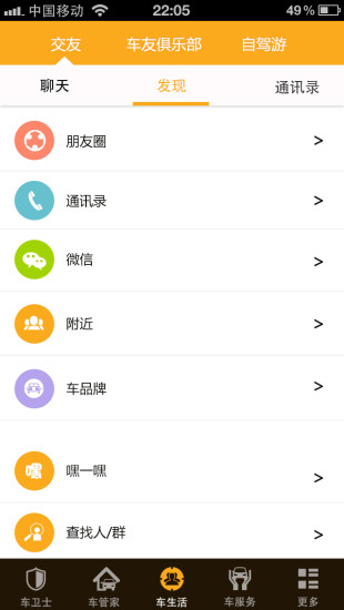 2.车生活:包括聊天、发现、通讯录三大部分。车生活围绕着车主的社交服务展开,车主可以通过嘿车提供的车生活平台结识朋友,畅谈生活。