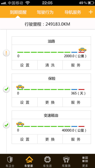 4.车管家:由到期提醒、驾驶行为、加油管理三大功能组成。到期提醒可以提醒车主爱车的行驶里程、车险、年审等数据;驾驶行为则可以显示车主行车的具体数据;加油管理则可以提供耗油数据并计算平均油耗以及消费等,为车主提供便捷的车辆管理服务。