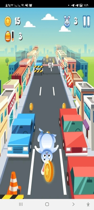 1、进入游戏后点击开始按钮,通过左右滑动屏幕操控兔子在三车道上左右移动,躲避迎面驶来的轿车、卡车等不同类型的车辆,初次体验可先适应基础车流速度。