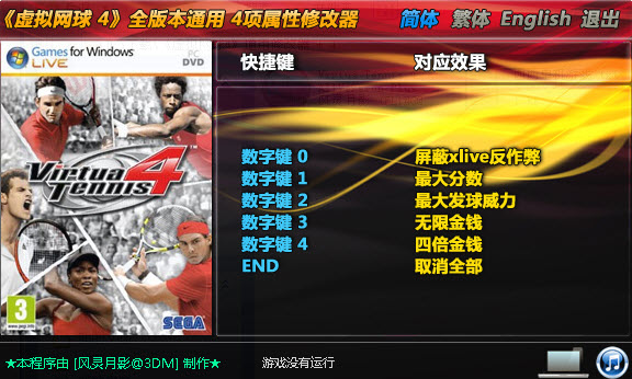 虚拟网球4风灵月影修改器是由玩家风灵月影专为游戏《虚拟网球4》制作的辅助工具,主要提供无限分数、无限金钱、四倍金钱、最大发球威力四项功能,还可以屏蔽xlive反作弊,更放心使用修改器。赶快下载体验吧!