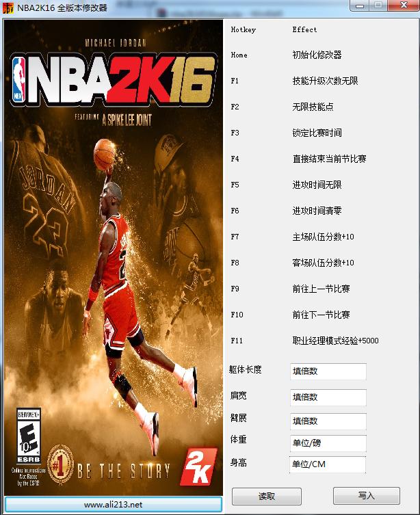 NBA2K16全版本十六项修改器适用于2k16所有版本的辅助工具,提供了进攻时间无限、无限技能点、客场队伍分数+10等共16项游戏属性值的修改,同时你还可以对人物的肩宽、体重的修改,需要的赶紧拿走吧。