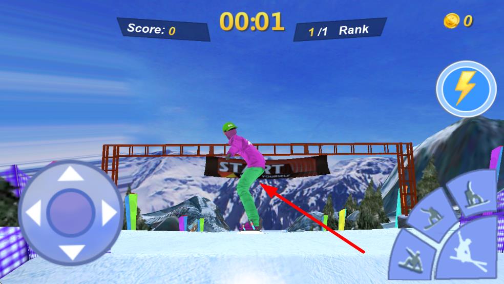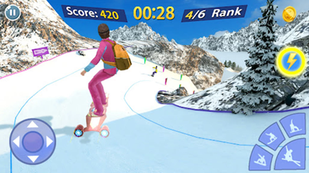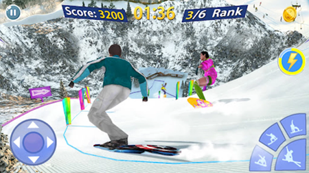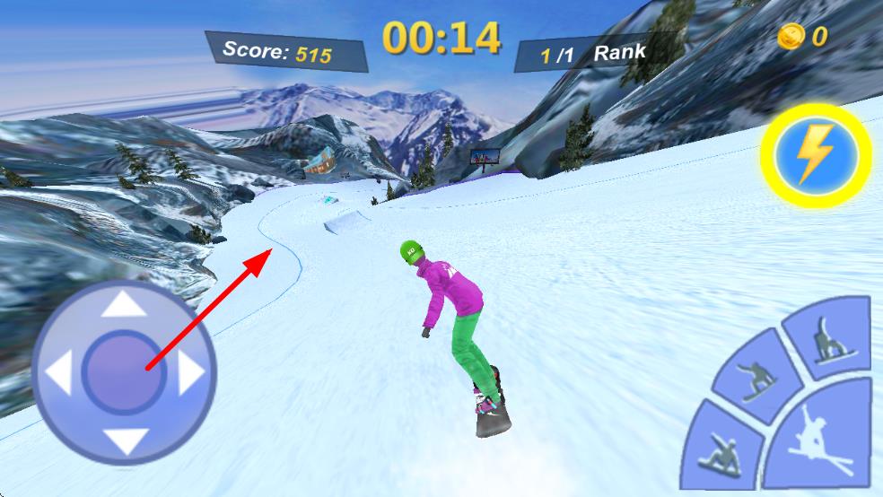 1、摇杆操控滑行:利用虚拟摇杆灵活调整方向,适应雪道弯道、坡度变化,保持高速且稳定的滑行节奏。