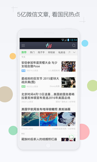 大料重磅上线!汇聚5亿热门微信文章,见闻趣闻个性化阅读,用大料,告别无聊,给生活加点料!是一款热门资讯浏览平台,这里有海量微信热门文章,每日实时更新,头条大事一收眼底,供你任性阅读,个性兴趣定制,选择自己喜欢看的,独创全新的个性化文章流展现,带给你全新的微信文章阅读体验,快来下载吧!