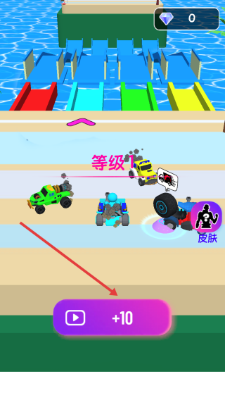1、在选车界面,点【+10】看广告获奖励,选蓝色怪物卡车,准备挑战关卡1。