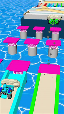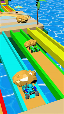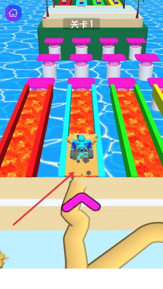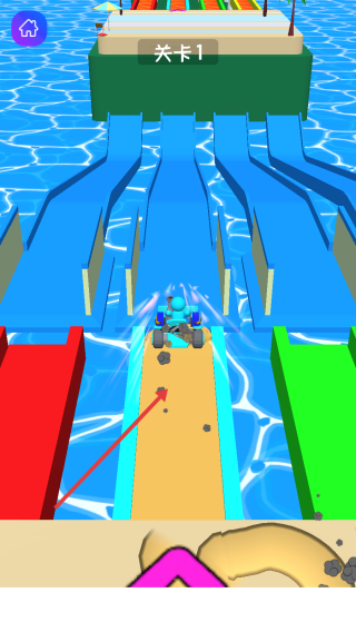 2、进入关卡1,沿蓝色赛道行驶,避障碍(如石块),冲过彩色滑梯,保持速度。