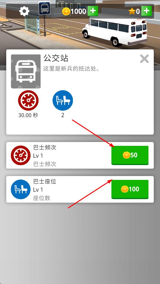 1、在公交站界面,花金币升级“巴士频次”“巴士座位”,提升新兵输送效率,保障人力补给。