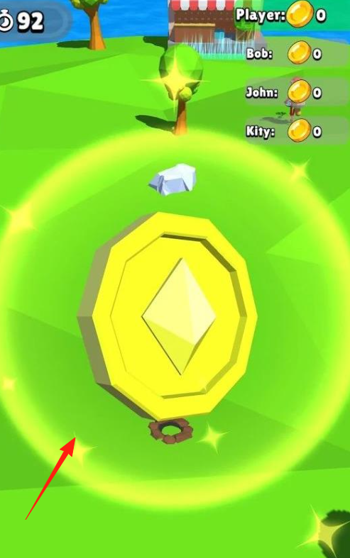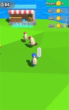 3、多人对抗(图与“Bob、John、Kitty”等玩家竞争,在限时(86→97→92秒)内,收集更多金币,提升排名。