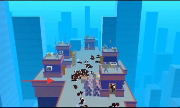 3、场景推进在城市建筑间(蓝紫色高楼),持续清理敌人,跨越屋顶障碍,完成逃生关卡。