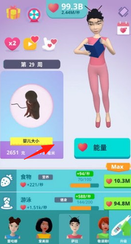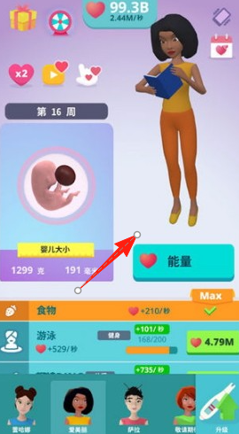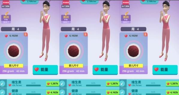 3、角色互动切换不同角色(穿粉、黄、蓝衣服),完成孕期任务,解锁升级、道具(礼物、日历)系统。