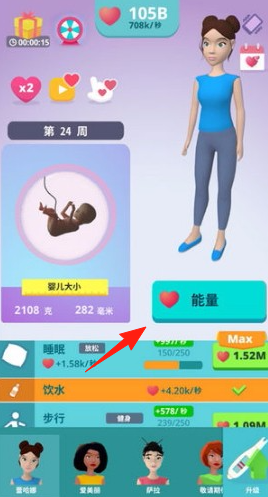 2、健康管理通过“食物、游泳、睡眠”等行为,提升“能量”(10.3M→4.79M→1.52M),维持孕妇与胎儿健康。