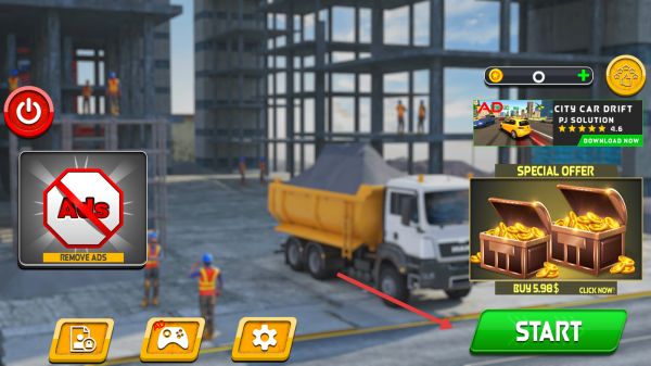 1、在工地场景主界面,点击【START】进入游戏,可选择移除广告或参与特惠。
