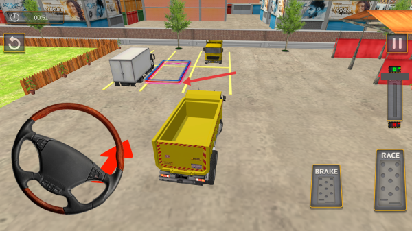 3、驾驶卡车时,用方向盘、刹车、加速键,将车精准停入指定区域,完成任务。
