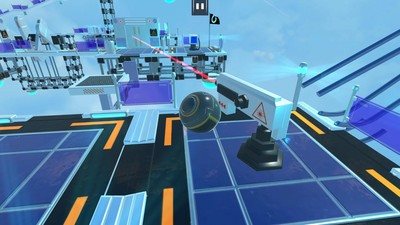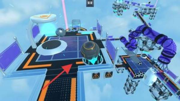 1、场景探索操控黑色球体,在悬浮天空的机械平台(蓝紫配色)滚动,探索激光、转盘等机关区域。