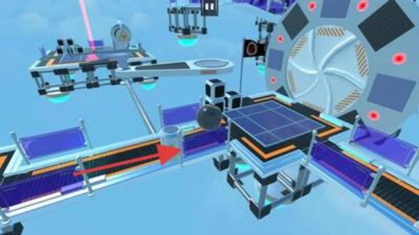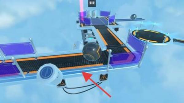 2、机关互动通过平台上的轨道、传送带(橙色),触发紫色机械臂、圆形装置等,推进球体移动。