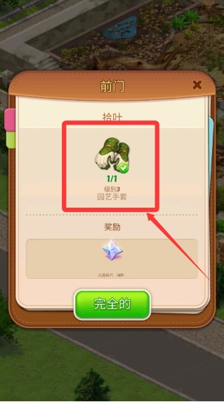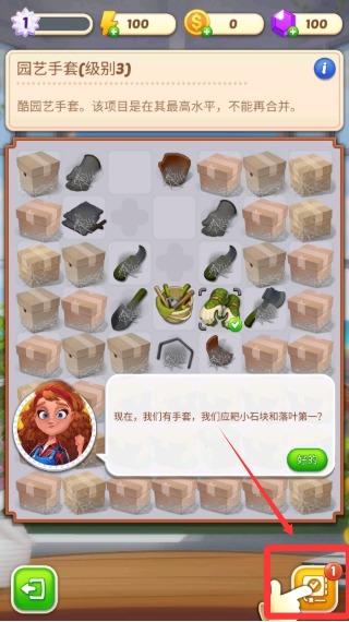 2、第一个任务是合并一个级别3的园艺手套,然后点击右下角。
