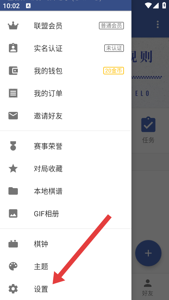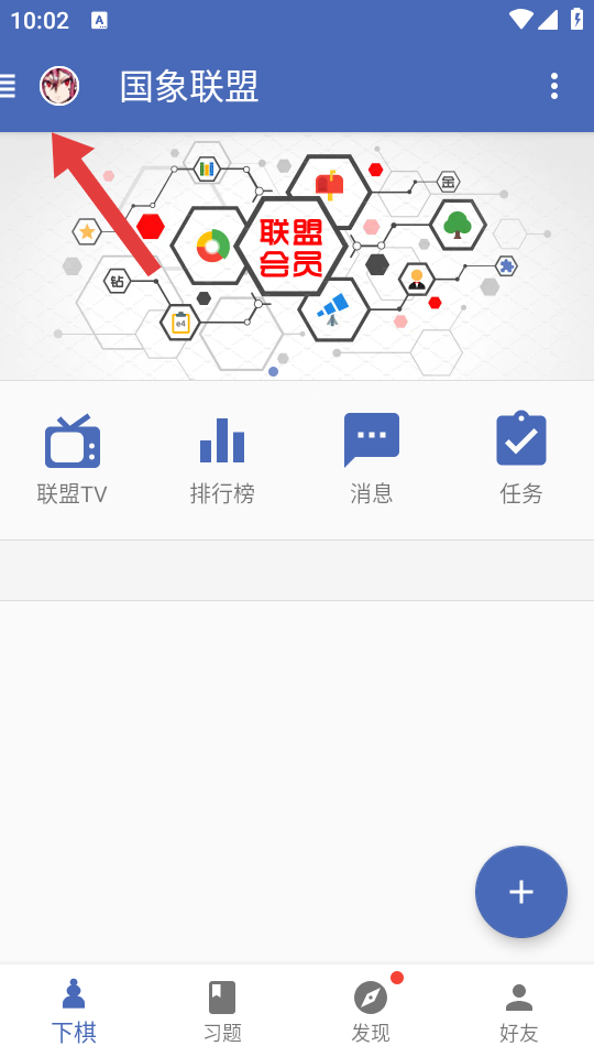 1、在国象联盟下棋页面,点击左上角的头像,展开侧边功能栏。