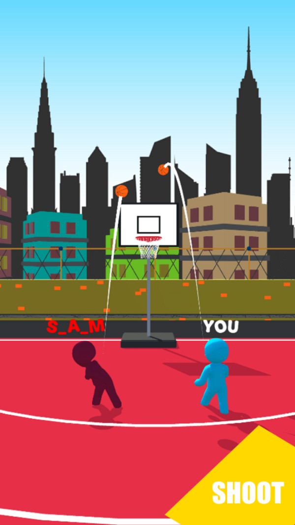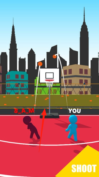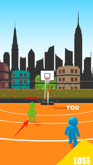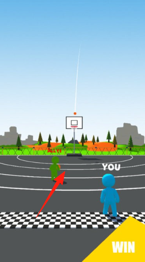 1、投篮竞技操控蓝色“YOU”角色,与对手(绿、紫、红角色)在户外城市球场,比拼投篮。