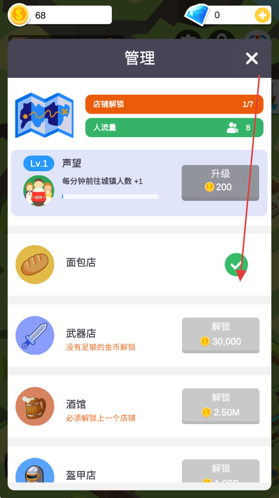 3、建“面包店”!解锁后,放城镇中心(人流多的地),每单赚68金币,存够3万,优先解“武器店”。