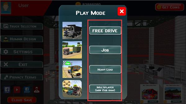 1、下载安装完成进入游戏后,点击屏幕下方按钮选择游戏模式,然后即可开启卡车驾驶模拟之旅。