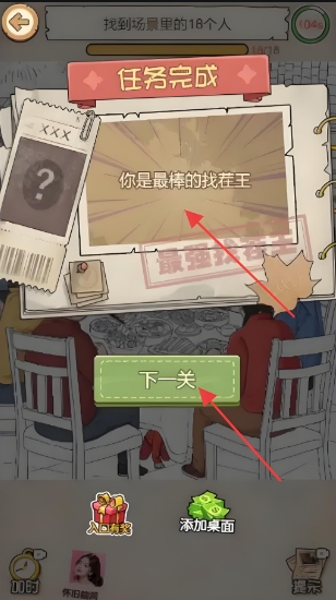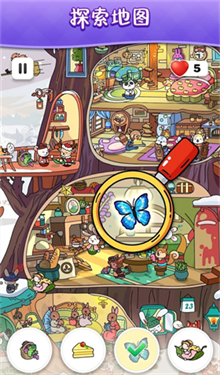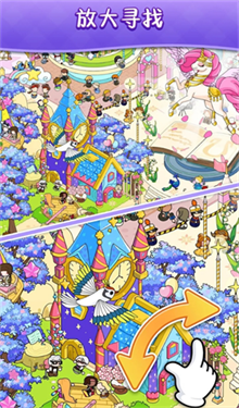 2、滑动缩放寻找物品:通过滑动屏幕、放大缩小地图各个角落,仔细观察细节,在限定时间内找出目标物品,完成关卡挑战后点击下一关,收集奖励继续冒险。
