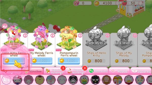 2、策略经营玩法:需根据角色人气度规划建筑布局,例如将凯蒂猫主题区与美乐蒂区相邻建设,考验乐园规划能力。