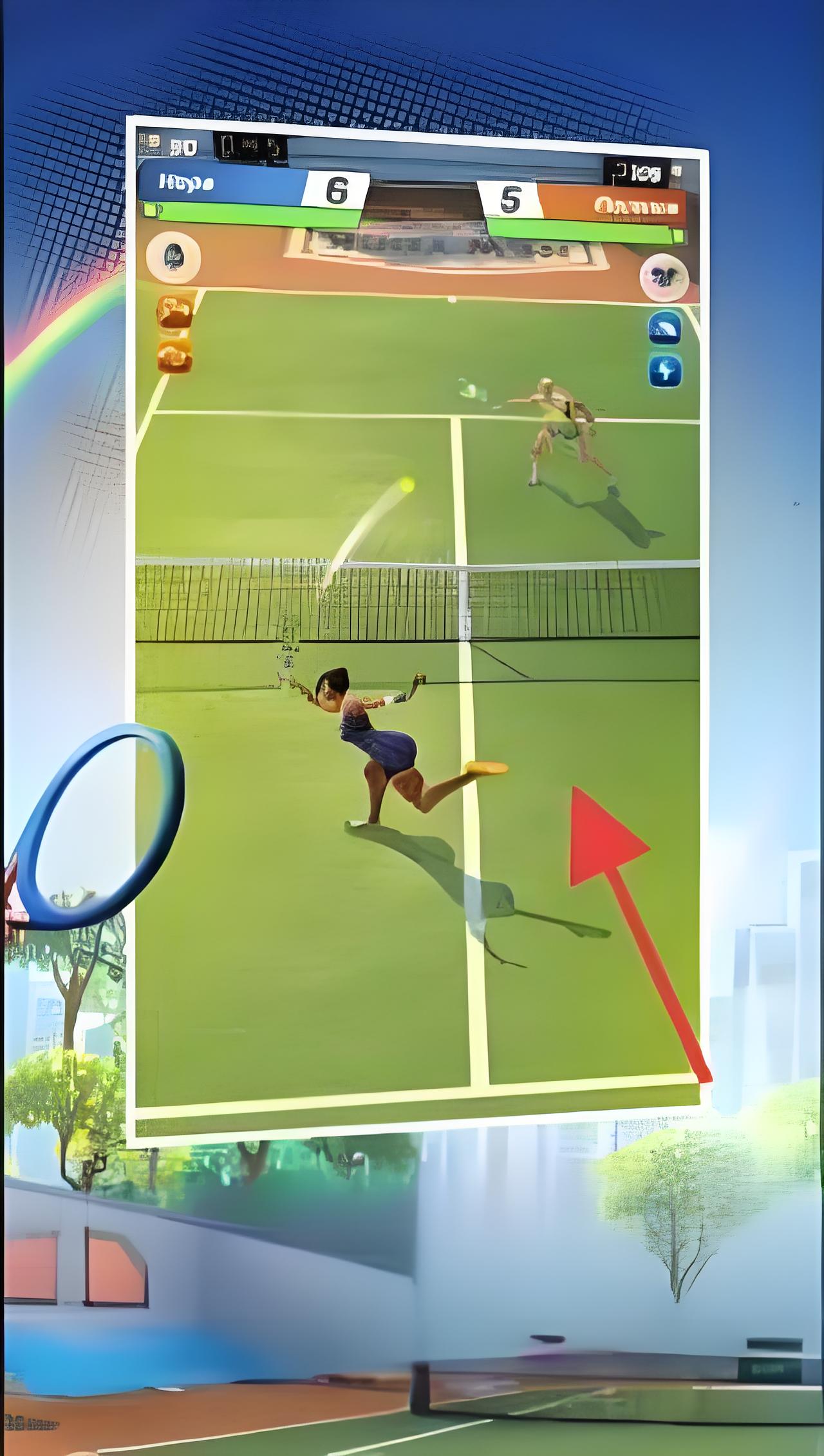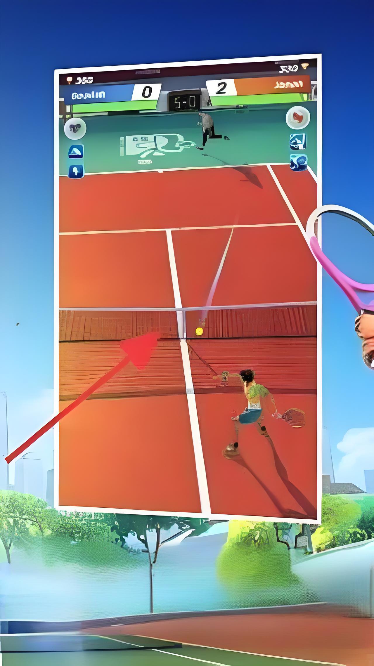3、操作机制通过(滑动得分直观操作)”,滑动屏幕控制击球方向(粉色球拍),在红色球场,精准击打网球,赢取胜利。