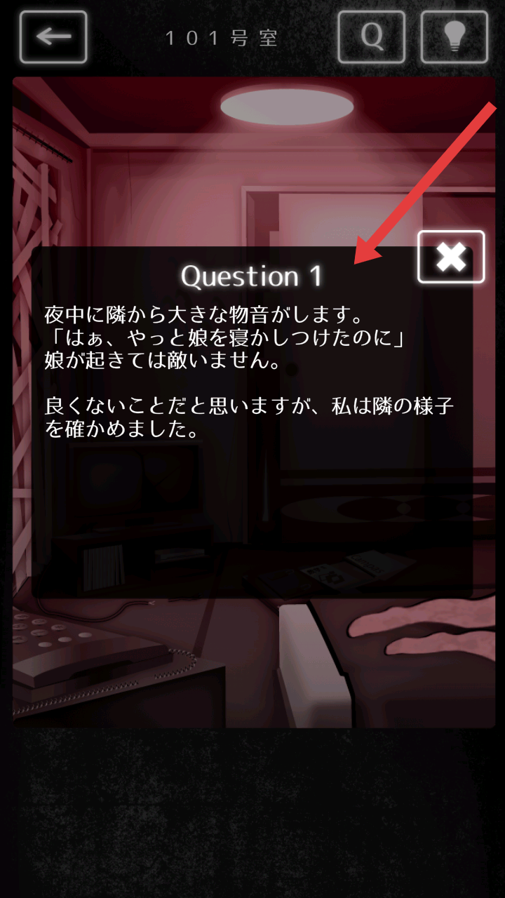 3、进入101号室后,需要阅读【Question1】的日文情境描述,梳理信息以推进后续解谜。