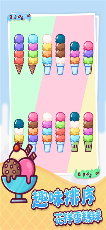 1、清新画风设计:采用画风清新简约的设计,打造趣味满级的冰淇淋分类小游戏,让玩家在清爽的视觉体验中享受分类排序的乐趣。