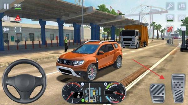 2、按场景提示(如收费站),操控车辆(如橙色SUV)平稳通过。