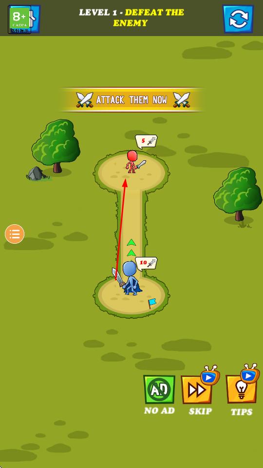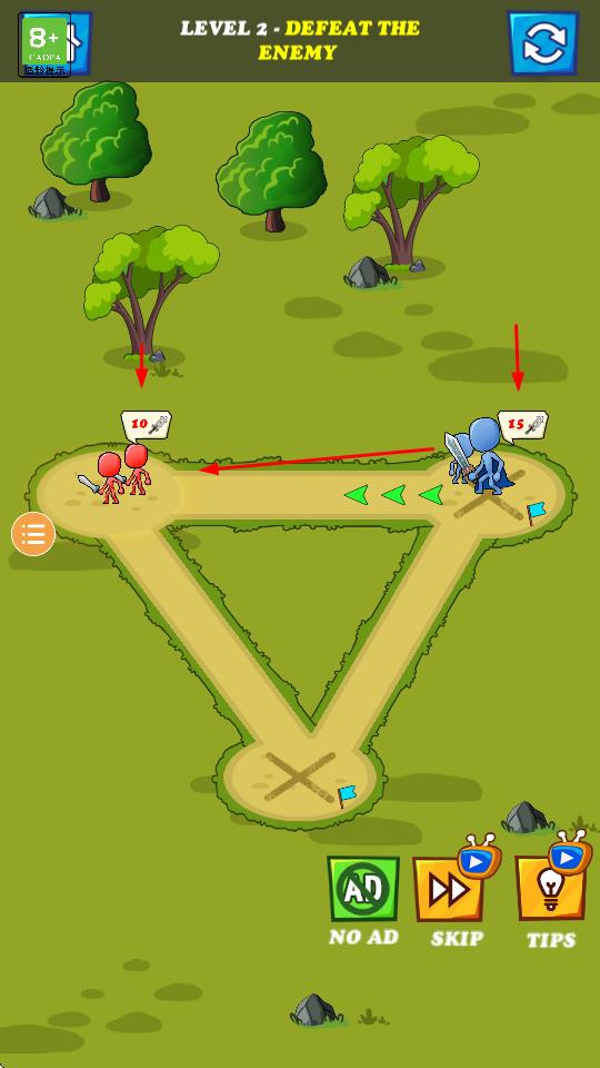 2、角色头上数字代表兵力值,战斗时需保证己方兵力大于敌方,通过数值优势击败敌人,推进关卡。