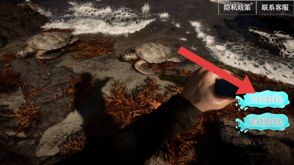 1、呈现的是初始界面,点击【开始游戏】方可进入,还有海龟、海浪、礁石等场景元素。
