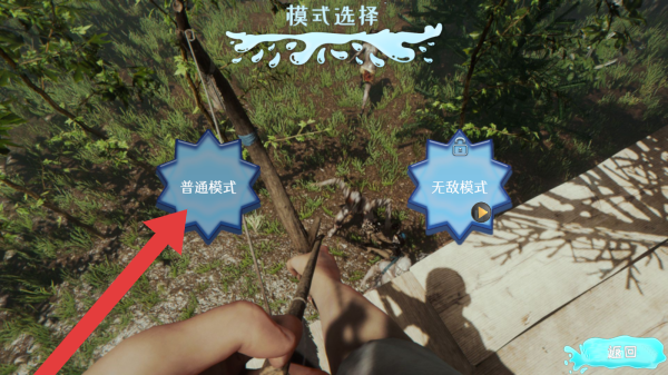 2、这是OceanNomad的模式选择界面,实体信息有“模式选择”“普通模式”“无敌模式(锁定状态)”“返回”,背景是野外场景,有植被、树木、人物等元素。
