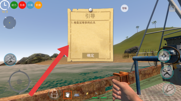 3、实体信息有“引导”任务(收集足够多的石头)、确定按钮,还有左上角的“耐力、生命、口渴、饥饿”状态显示,以及界面中的操作按钮、场景(海边、船只、岛屿等)。