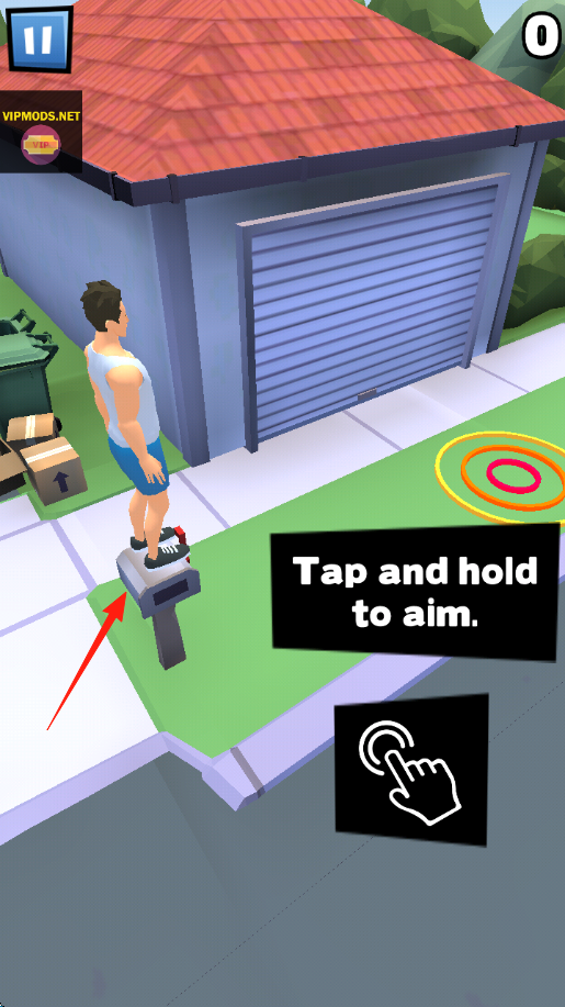 1、操作引导角色站在跳板,“Tapandholdtoaim”提示长按瞄准,调整跳跃方向,准备在街道场景(车库、绿植)开始跑酷。